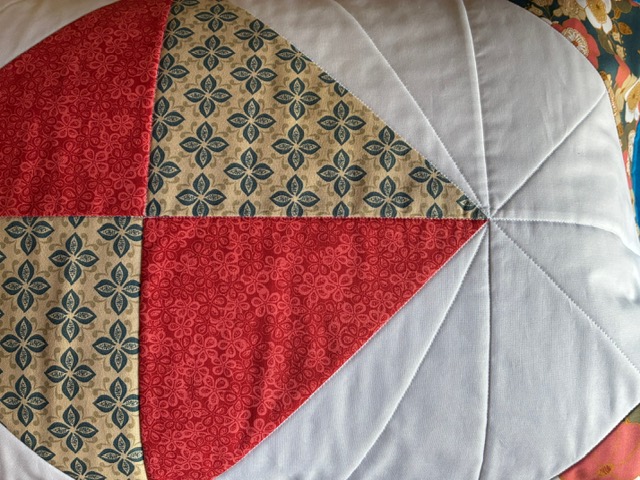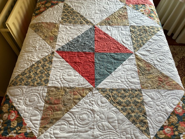 The lovely quilting of swirls and flowers in white thread completes the beautiful look of this quilt.