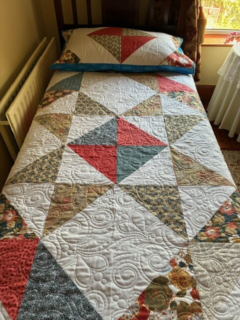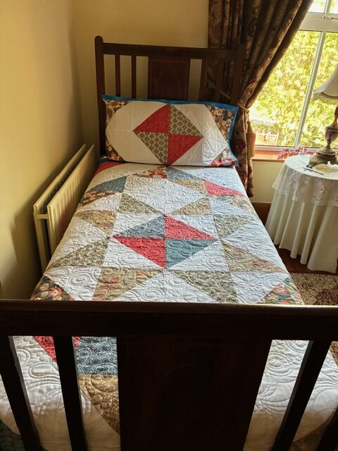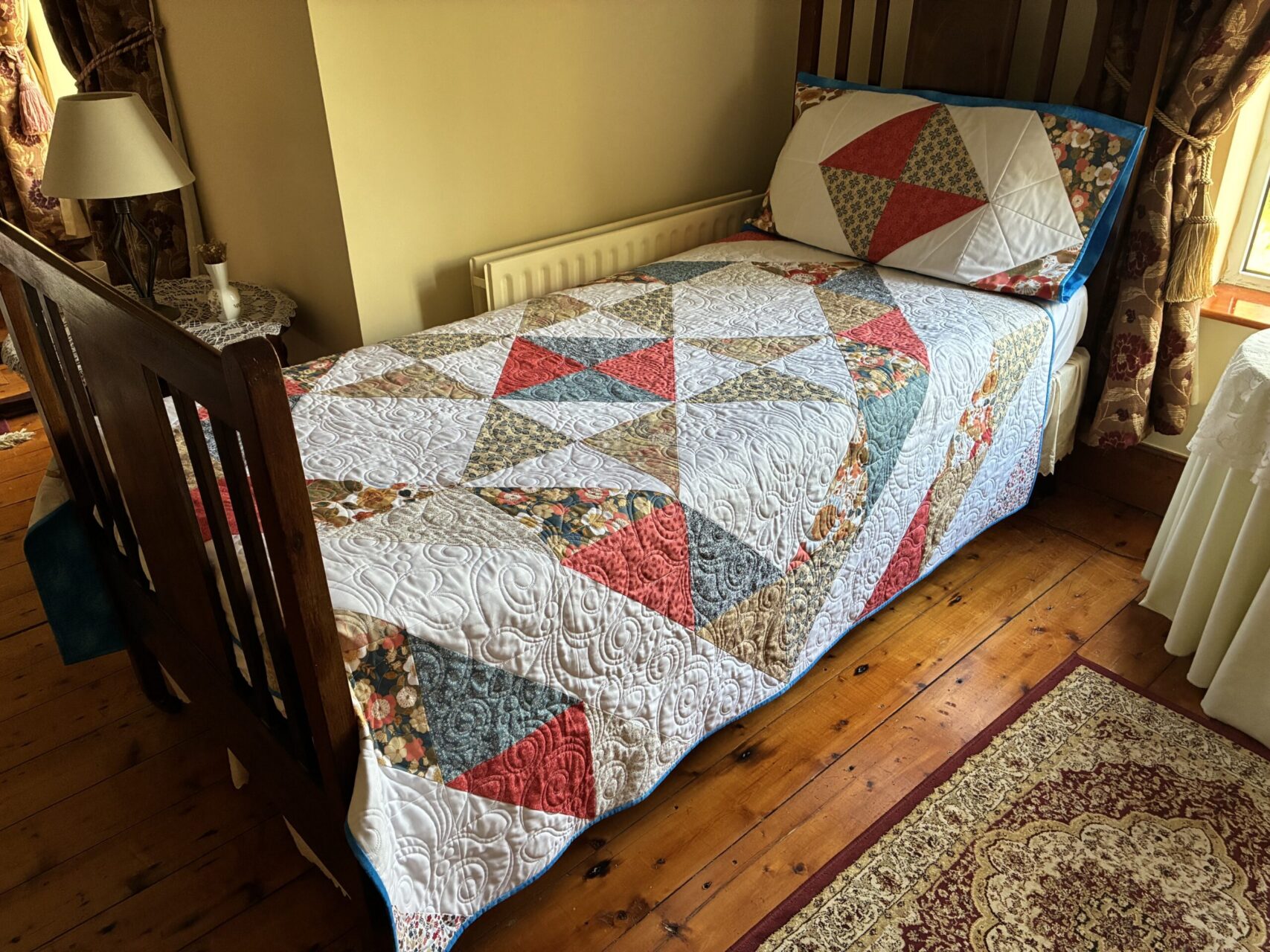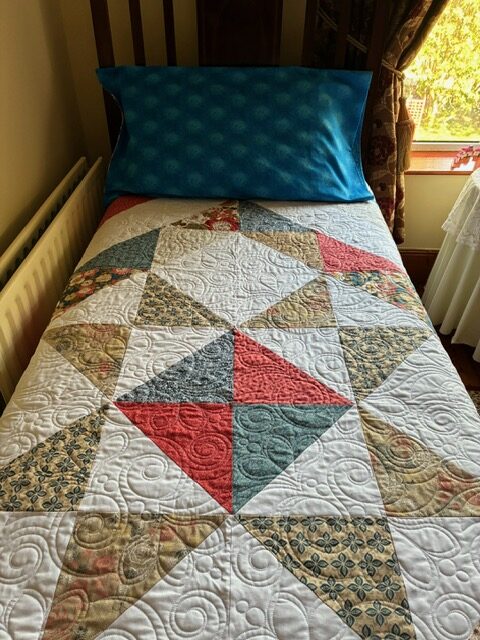 At 72″/183 cm square, the Diamond Star Quilt will hang down almost to the floor on both sides of a single bed. The length is long enough to tuck into the end of the bed. It will reach to the bottom end of the pillow area at the top of the bed. However, the pillow sham is large enough to cover the pillow area, as the photos show.